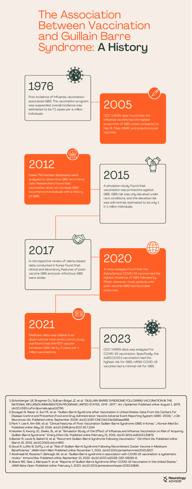 These findings helped to substantiate a small but significant association between GBS and vaccination and lead to an increased sensitivity to vaccine adverse events and monitoring tactics. As vaccine safety became increasingly monitored, GBS association with vaccines other than influenza began to be studied.