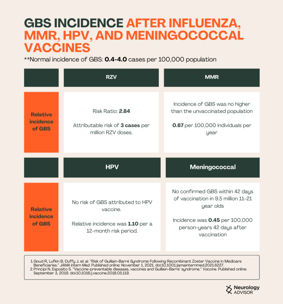 The incidence of GBS has been closely monitored as a potential adverse event following influenza vaccination, leading to investigations into its occurrence with other vaccines, including recombinant zoster virus (RZV), MMR, human papillomavirus (HPV), and meningococcal vaccines.
